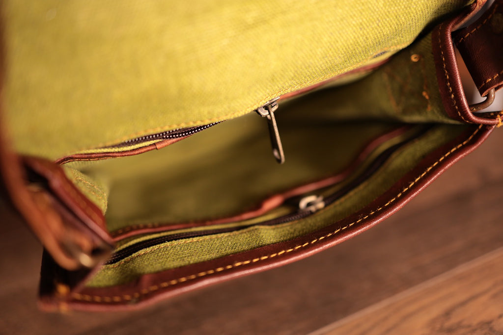 The Luxurious leather mean's Satchel bag Features *****Warning***** Not responsible for all the comments, questions and compliments you will get when using my bag. Green canvas fabric Internal 2 compartments and 2 zipper 1 small pockets on front of the bag Back side 1 zipper Thick adjustable strip SIZE: 11 (long) x 9 (wide) x 4 (deep) Strong, light-weight leather, tanned without the use of chemicals Leather softens and darkens with use Color and texture of the leather varies Natural real leather Solid brass buckles and fixtures - will last for years Has a wonderful natural look, and feel Each bag is uniquely individual due to slight color and marking variations on natural leather Brand New Handmade Leather Bag without tags