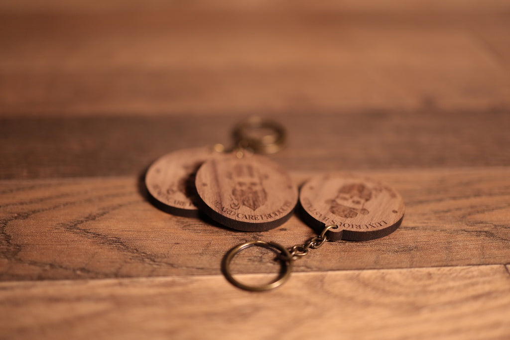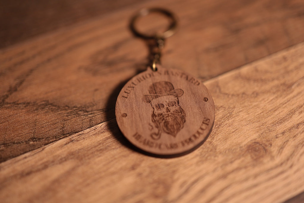 Luxurious Laser Etched Walnut Wood KeychainsLaser design logo on walnut wood incorporating some sweet aged patina brass hardware.Treat yourself and represent the Luxurious Brand. Light weight with a big statement & won't weigh down your key chain.