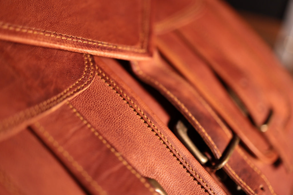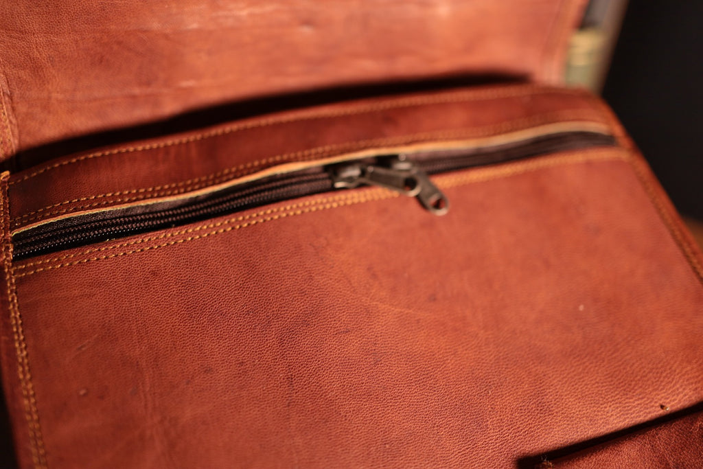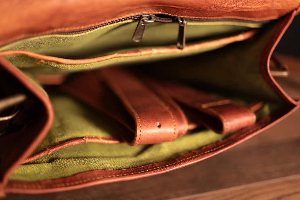 Larger Luxurious leather Satchel bag Features Green canvas fabric Internal 2 compartments and 2 zipper 4 small pockets on front of the bag Converts into a backpack Thick adjustable strap SIZE: 16" (long) x 11" (wide) x 5" (deep) Strong, light-weight leather, tanned without the use of chemicals Leather softens and darkens with use Color and texture of the leather varies Natural real leather Solid brass buckles and fixtures - will last for years Has a wonderful natural look, and feel Each bag is uniquely individual due to slight color and marking variations on natural leather Brand New Handmade Leather Bag without tags